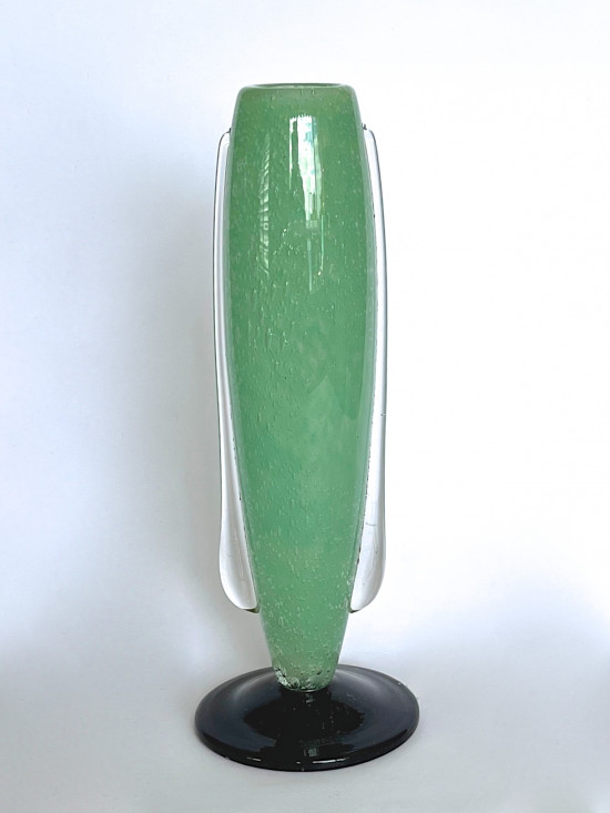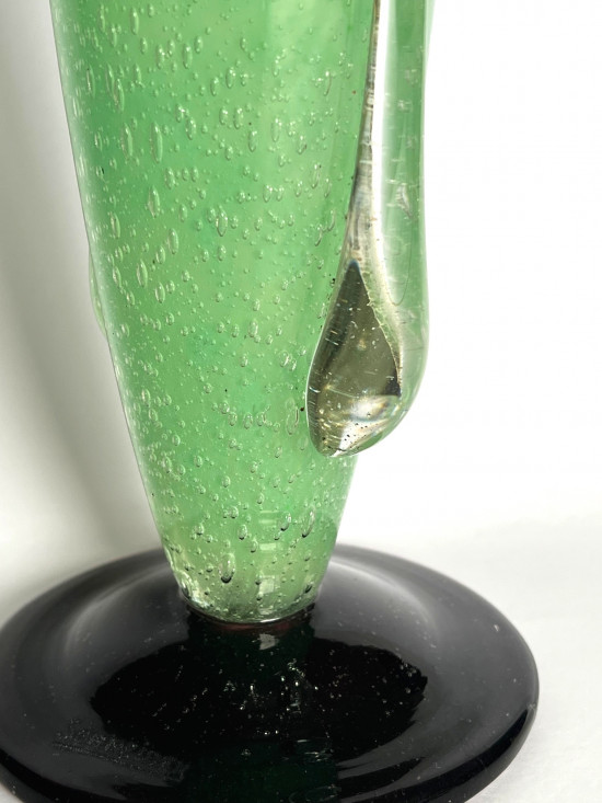An elegant Art Déco vase with applied clear glass 'tear drops' and applied deep violet foot. The green glass body with entrapped air bubbles within a clear glass layer. Etched signature to foot 'Schneider'.