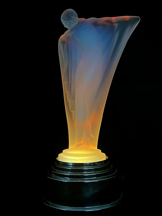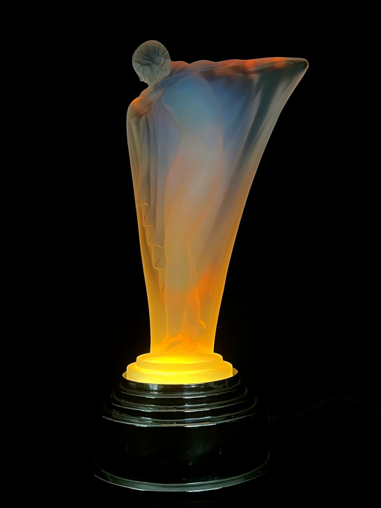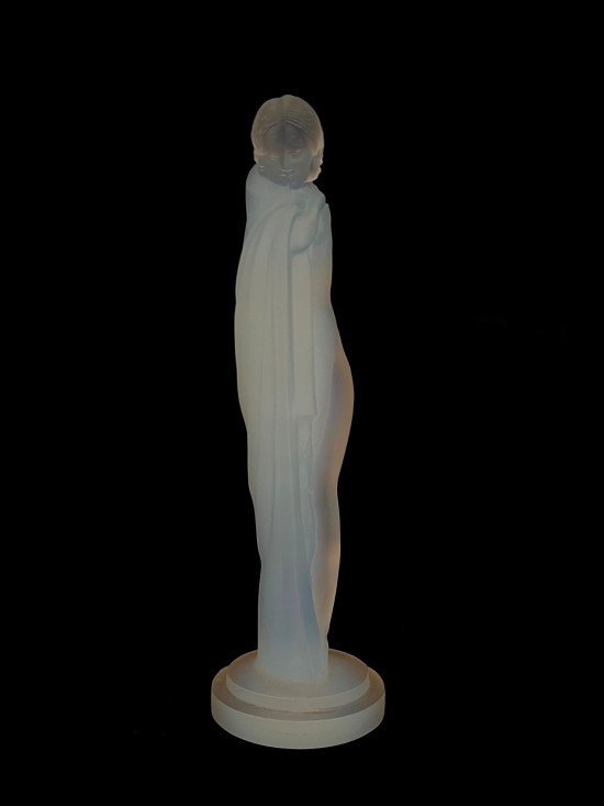 An Art Déco opalescent glass statuette of a draped nude with her arm outstretched. With original rare illuminated nickeled chrome base. Moulded signature "Etling France". Designed by sculptor Lucile Sévin.