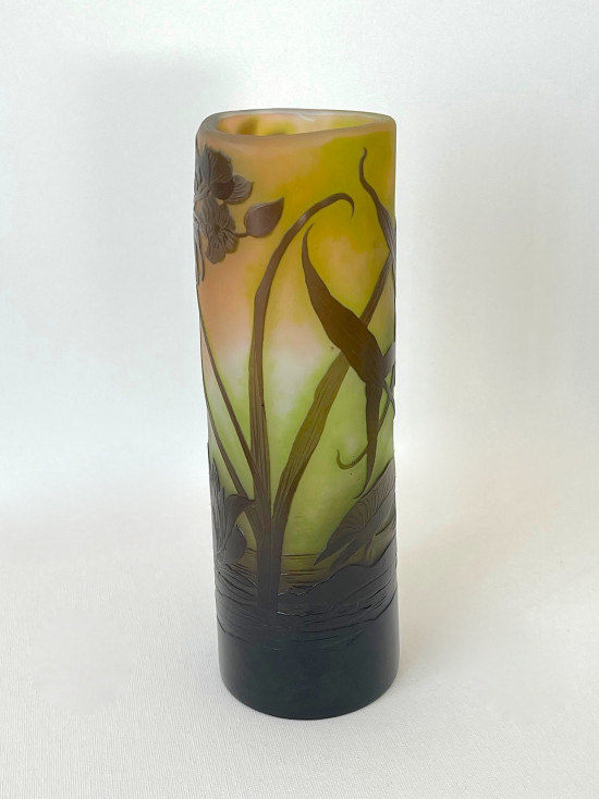 An Art Nouveau cameo glass of cylindrical form tapering to a shaped rim and decorated with marsh marigolds & waterlily. Signed in cameo Gallé.