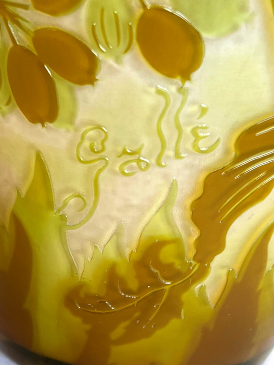 A fine & rare cameo glass vase, the white & rose coloured ground overlaid with green & honey colour then acid etched with a design of Umbel flowers. The entire surface textured & fire polished. Signed with the rare Calligraphic Gallé signature in cameo.