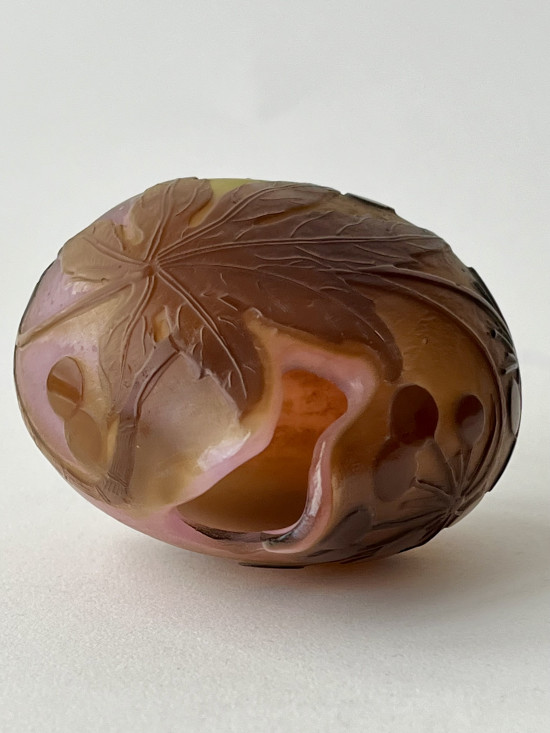*It has been suggested that the opening of this vase has been modified at some point. A Galle glass expert in France I have been in contact with, has noted published evidence that the glass workers at the factory were permitted to re-work salvaged pieces in their own time. A similar example has appeared from a Galle factory worker's private collection. The rim is finely worked and is sympathetic to the decor of the vase. It can only be the handy work of a highly skilled glass worker. Most modified pieces appearing on the market are mearly cut down and ground flat.