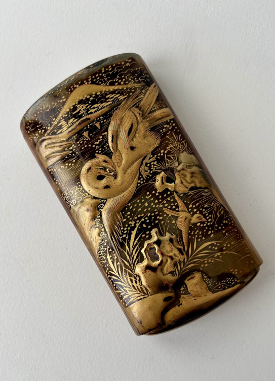 An exquiste Japanese Meiji Period Tortoise Shell & Lacquer Case finely gilt and lacquered depicting the mythical Hōō Bird & other birds, Mount Fuji and other decorative devices. Small areas of Mother of Pearl inlay.