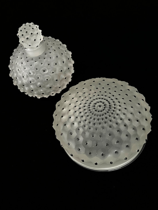 An early post war frosted glass perfume bottle and powder box moulded in relief with a design representing a cactus plant, with black enamel highlights. The perfume bottle design was introduced in 1931 and the box in 1942. Early post-war stencilled signature 'LALIQUE,FRANCE'.