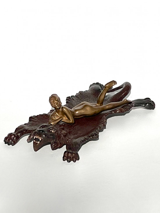 A rare Vienna Art Nouveau gilt bronze sculpture of a nude woman lying on a cold-painted lion skin rug.
